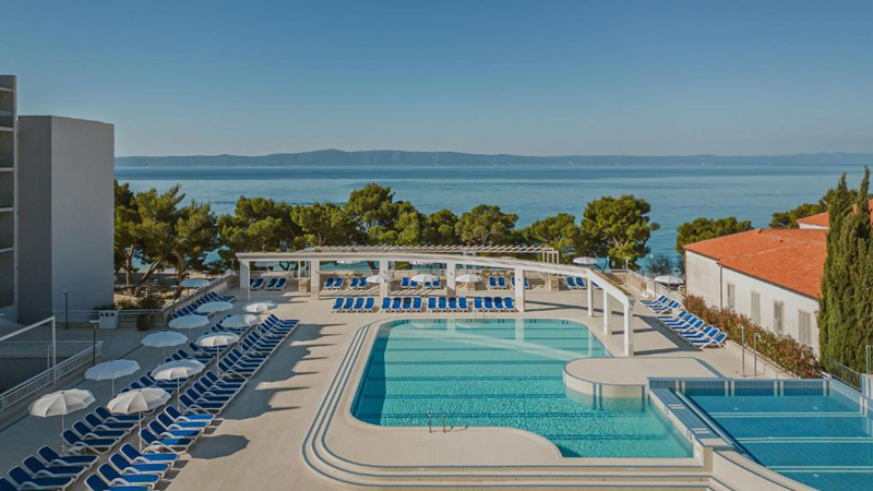 Hotellet ligger alldeles intill den längsta stranden på Makarska Rivieran där alla kan hitta sin plats under solen eller i skuggan av medelhavets tallar. Vid hotellets rymliga poolområde finns parasoller och solstolar som är gratis för alla hotellgäster. Här finns sällskapsytor för gemenskap, inbjudande serveringar och aktivitetsområden för den med spring i benen. Längs strandpromenaden finns ett stort utbud av restauranger, glassbarer och småbutiker värda ett besök.